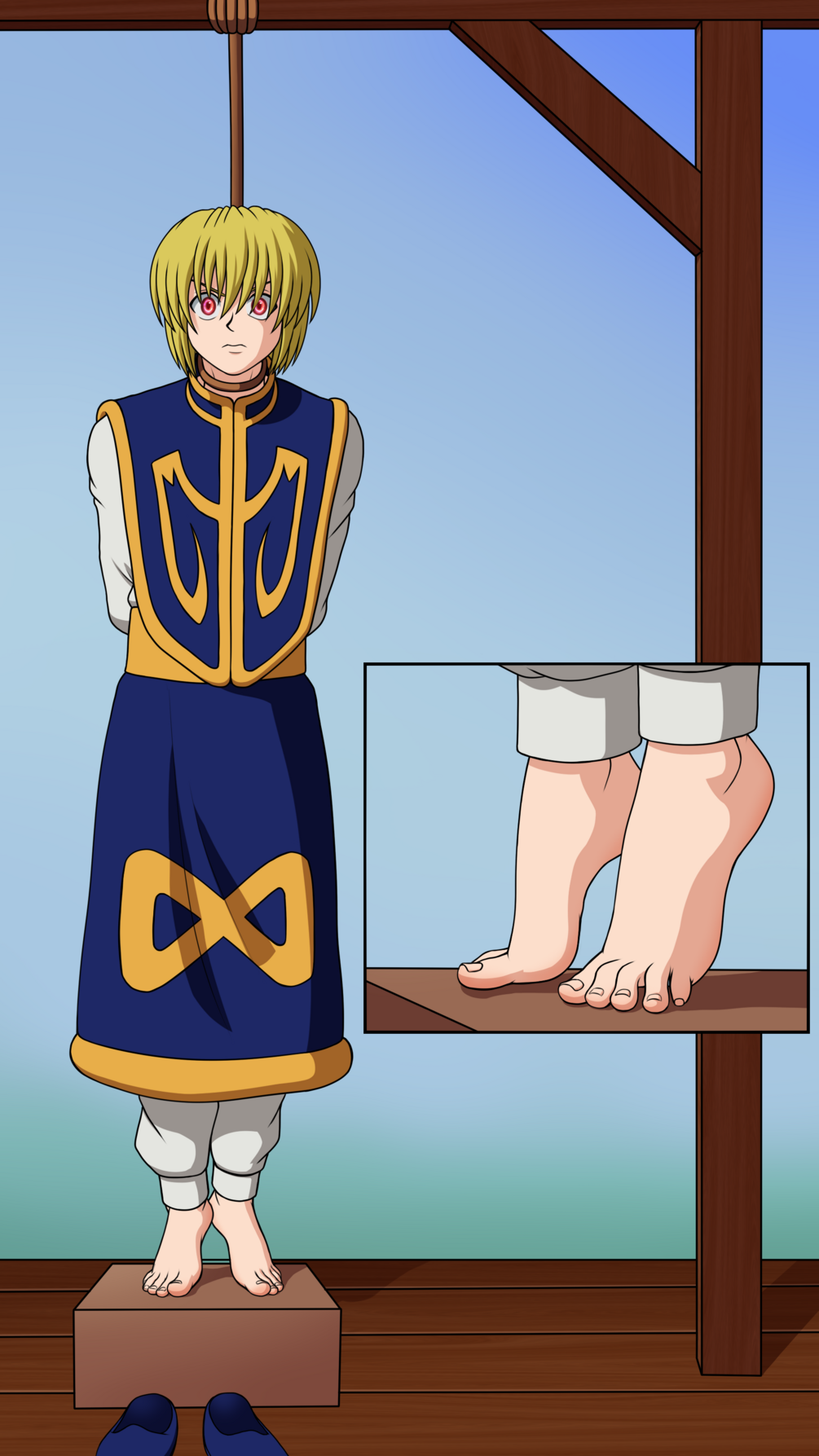 Kurapika has been framed for a crime he did not commit! Before being publicly executed, the last of the Kurta clan has his clan's memory shamed as a result of the Phantom Troupe's doings! Kurapika's situation is hopeless... He teeters on a block he is barely able to reach with his tip-toes. In mere seconds, the block will be kicked from under his feet, ensuring a long and humiliating death via strangulation!